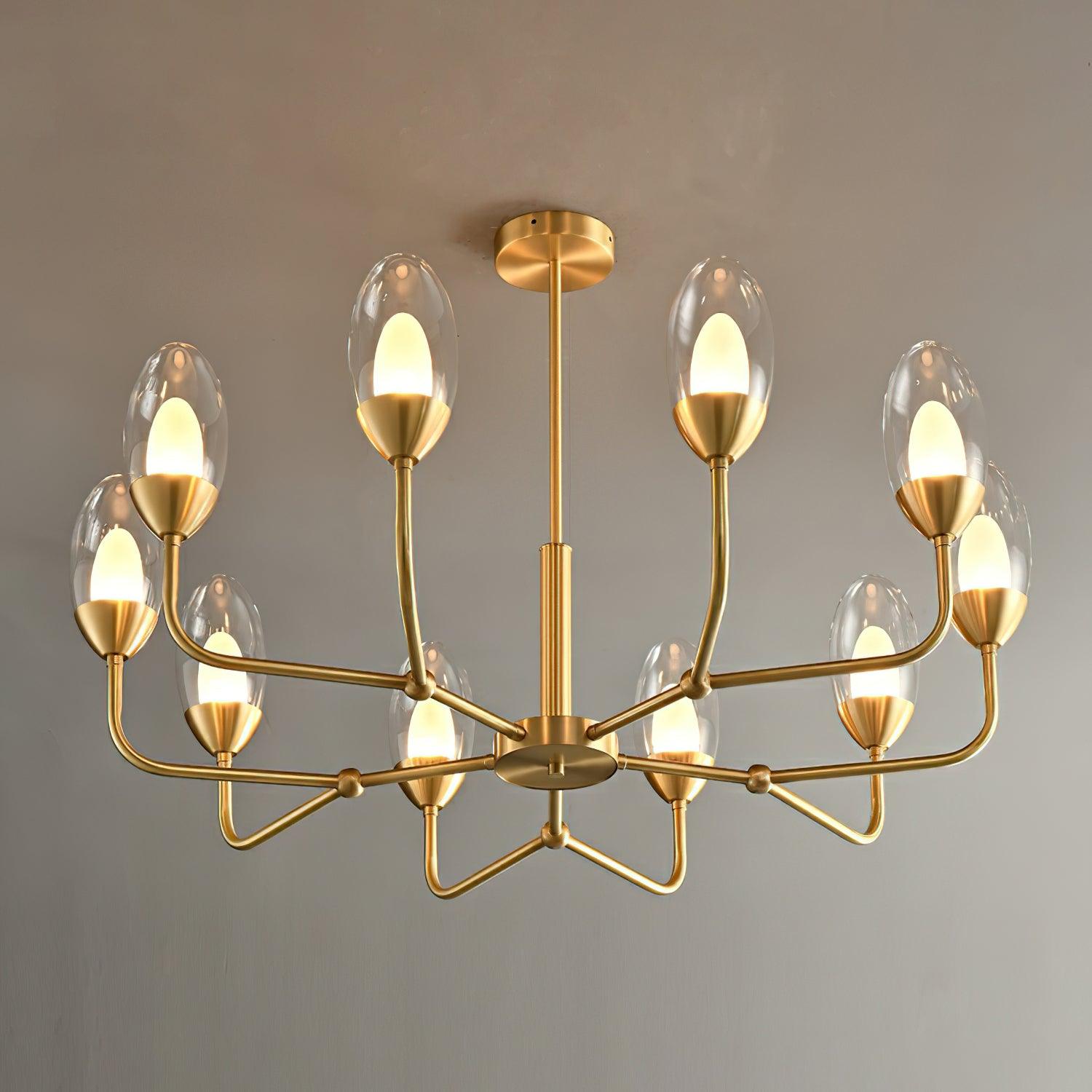The lampshade is like a crystal clear pebble, emitting a warm and soft light. The golden lamp arm and base add a sense of modernity and luxury, making this chandelier not only suitable for modern style rooms, but also able to inject a touch of elegance and nobility into traditional spaces. The simple yet gorgeous design perfectly blends into various interior decoration styles and becomes the finishing touch of the space.