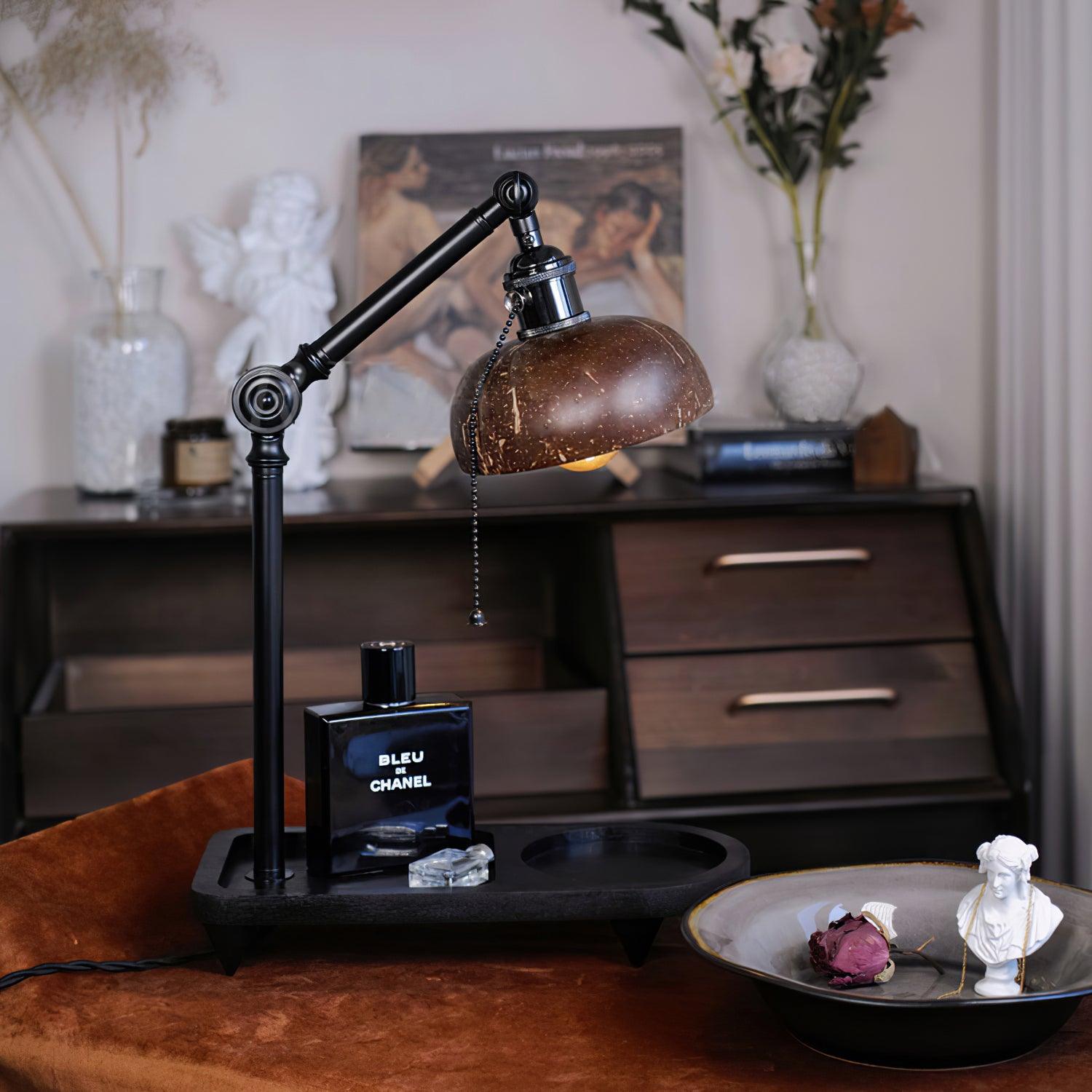 Be inspired by the glow of this Christian Dell Table Lamp. Its sleek black metal body and handmade coconut shell lampshades make it a beautiful addition to any room, while its adjustable height guarantees a pleasant light no matter where you place it.