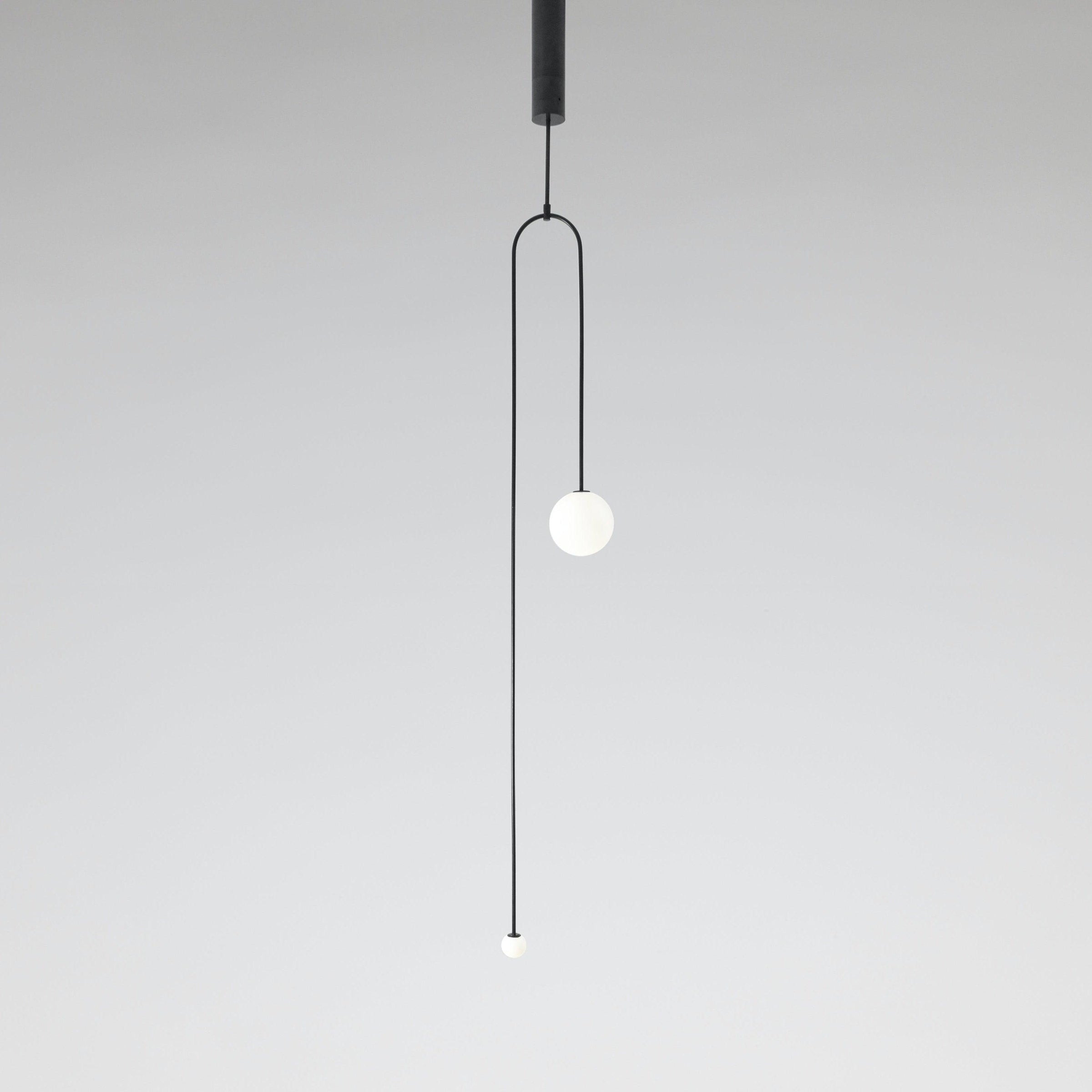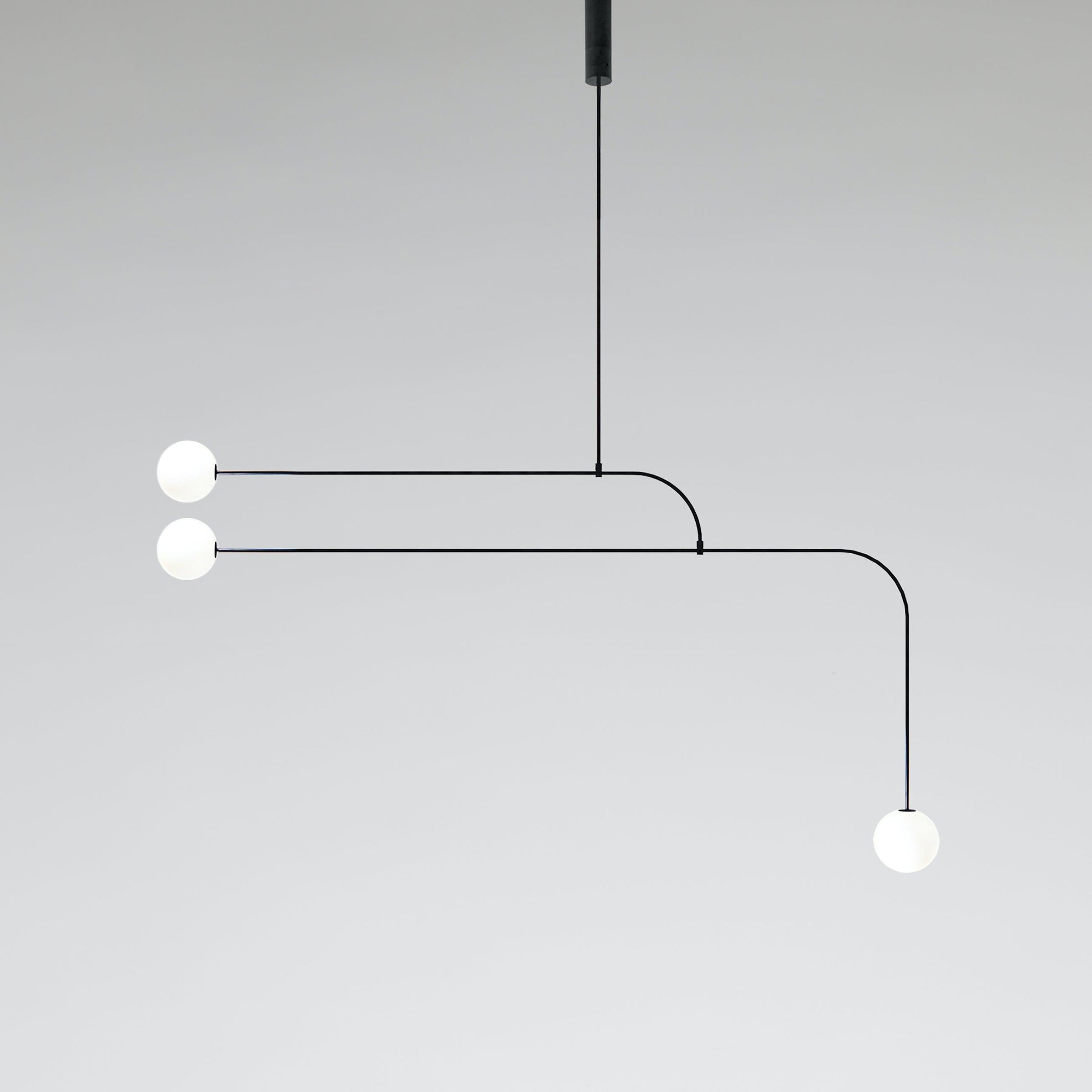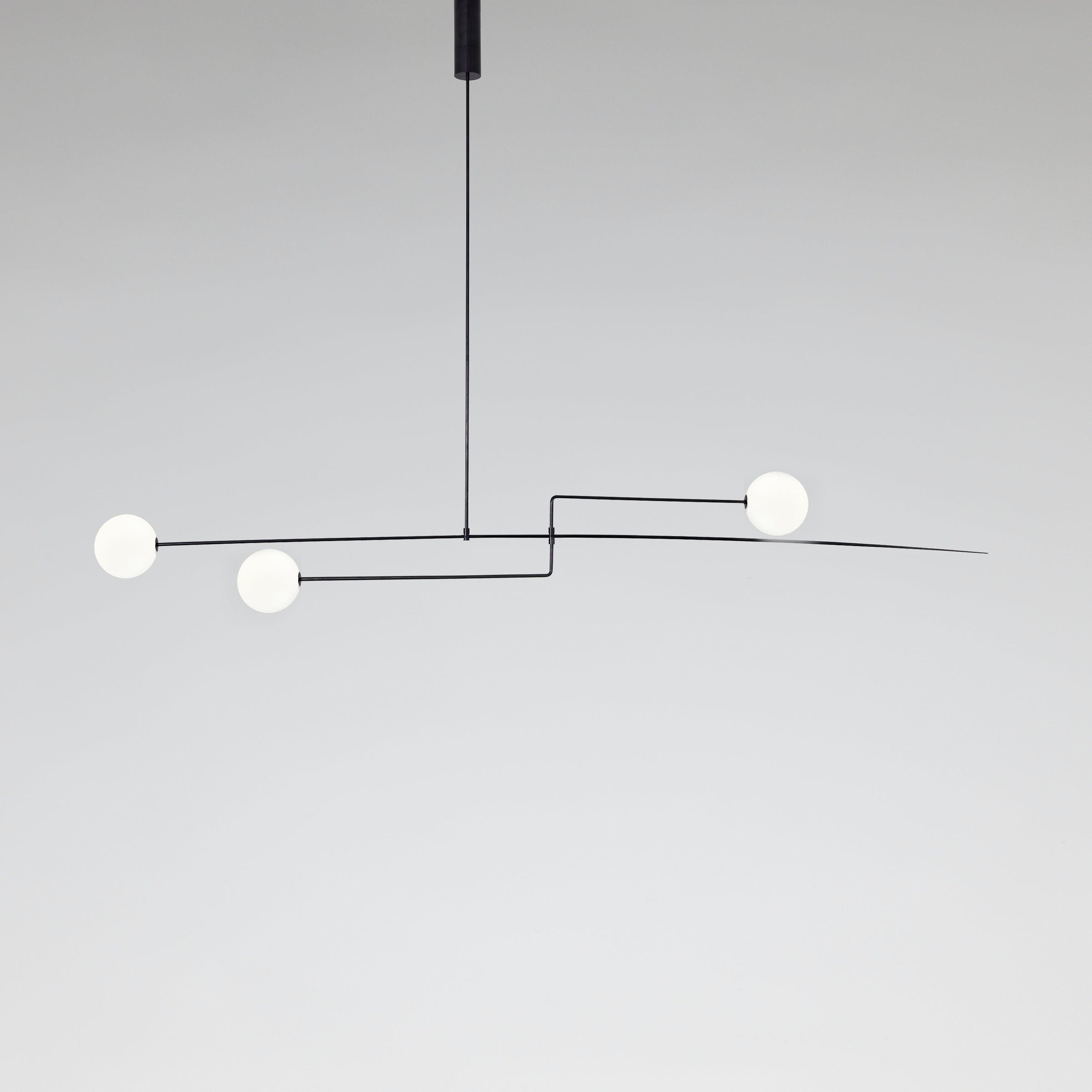The Mobile Chandelier adds a modern touch to any room with its minimalist design featuring uncluttered forms and warm light from white blown glass. Its graphic lines create an eye-catching illumination that blends seamlessly with any décor.
