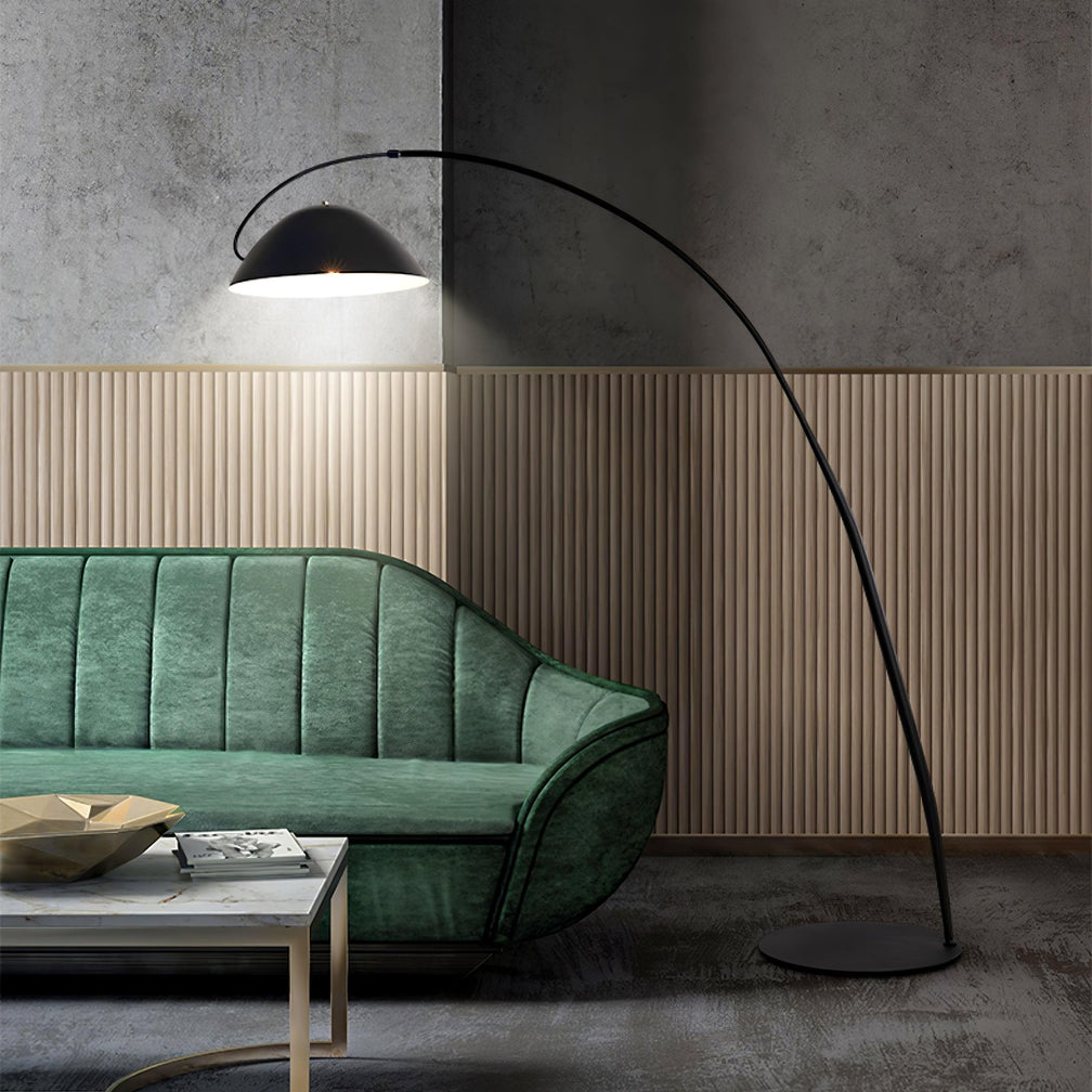 When designing the Pluma Floor Lamp, Our wanted something new and something that just has to be. The familiar would be the timelessness of the classic arc profile. The unexpected For starters, the arc is extendable, allowing variable adjustments to the height and width of the fixture. And then there is the shade configuration, flipped to face the stem and deftly balanced on a single point.